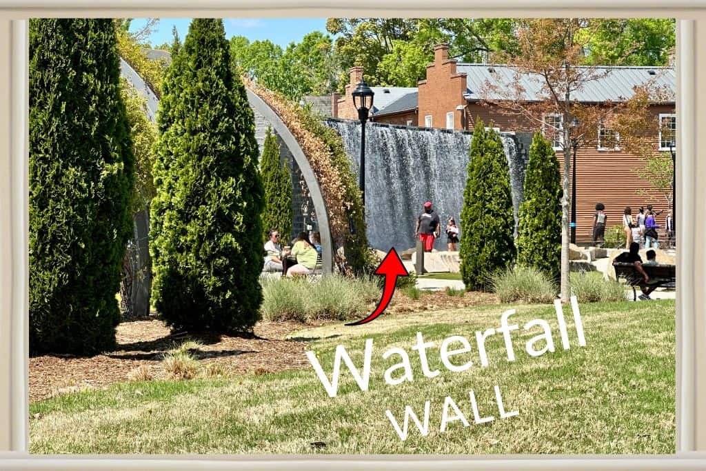 One of the most unique features is the cascading water wall, where water flows down in a steady sheet—perfect for cooling off on a warm day (and yes, I saw at least one very happy dog making the most of it).